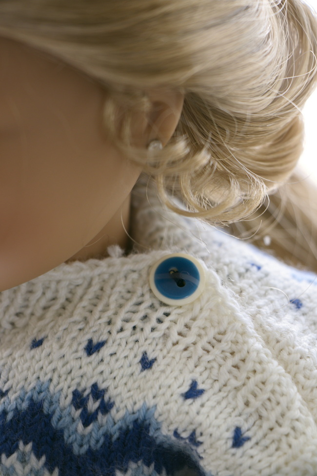 Denne gangen har dukken fått noen vakre klær til vinterferien. Jeg strikket dem i to blå farger og hvitt. |