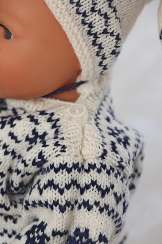 Die Hose und die Mütze habe ich in weiß gestrickt. Das wollte ich so, da so die blaue Farbe in den Musterteilen gut zur Geltung kommt.