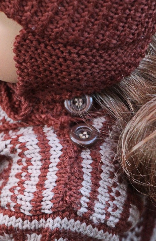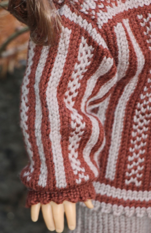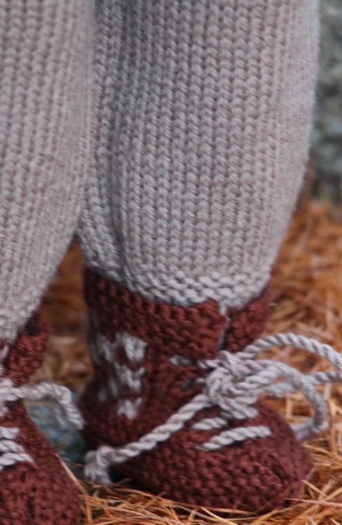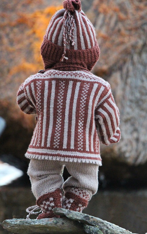 ... one of best designs. For Linus I knitted a lovely and warm beige suit with pattern I brown round the arms and the legs. Along the front band it has brown buttons.