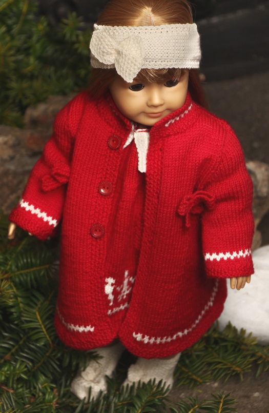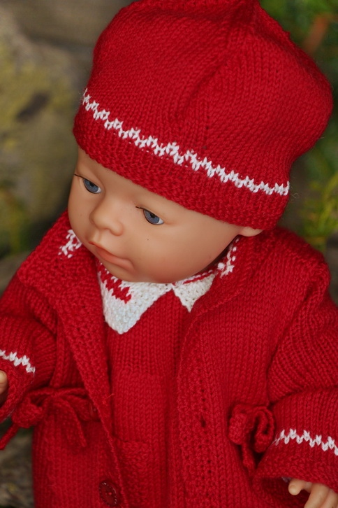 Toen dacht ik dat heel fijn zou zijn om haar een rode mantel en muts te breien om te dragen als ze met Kerstmis naar buiten zou gaan, dus hier zijn ze!