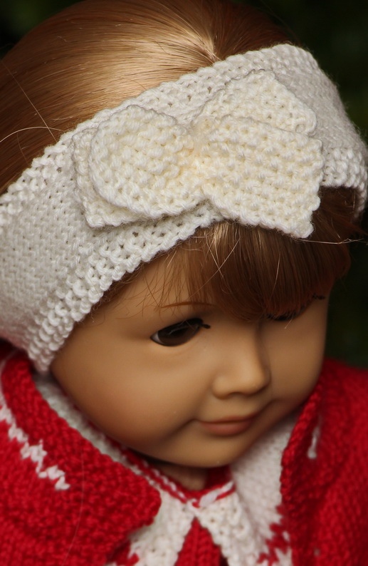 De haarband is gebreid in het wit met gerstekorrel randen met een grote strik in gerstekorrel gebreid en op de haarband genaaid.