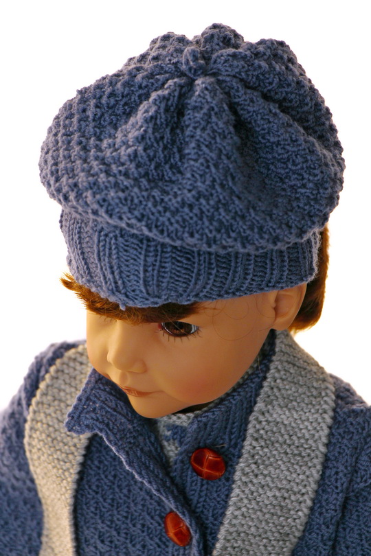 En posete lue strikket i dobbelt perlestrikk med ribbestrikket kant ble ganske flott til dette settet. Sophia ble riktig tøffJeg håper du også vil like denne ideen om å følge dukke hele året, og se frem til nye klær til dukken Sophia hver måned! Kos deg med strikkingen. Hilsen Målfrid |