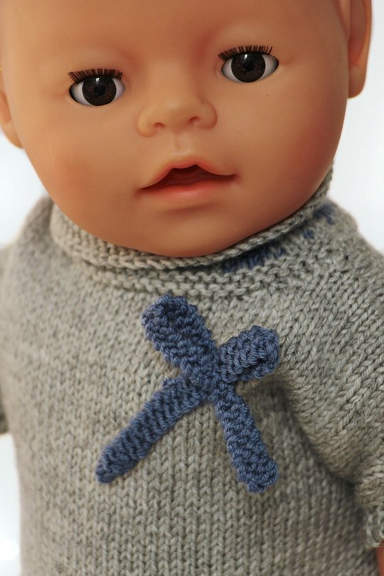 Jeg har sydd i litt store brune lærknapper langs stolpen slik at jakken virker litt tøffere. Dette kan du jo velge selv. Det kan være like fint med små grå knapper her. Baby born ble kjempeflott.