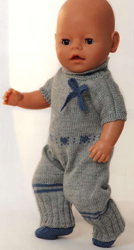 I år (2016) vil vi kle opp dukken vår Sophia. Hun vil få et nytt antrekk hver måned. Jeg har strikket dette første settet i grått og blått for januar modellen, design SOPHIA (Januar). Vrang-borden er vid, men den er likevel noe smalere enn resten av benet som har fått et par blå striper i begynnelsen av glattstrikket rundt bena. |