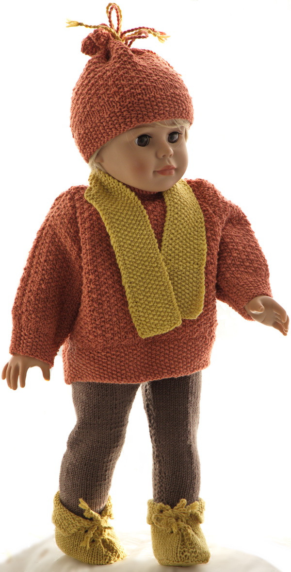 Obwohl nun der Winter kommt, haben wir noch wunderschöne Herbstfarben an den Blättern der Bäume. Als ich diese schönen Farben beim Wandern sah, da dachte ich, ich würde gerne ein tolles Outfit in diesen Farben für Ihre Puppe stricken. Die Puppenkleidung ist mit weicher Merinowolle von Sandnesgarn gestrickt. Ich habe wieder diese feine Merinowolle verwendet. Puppensachen, mit diesem garn gestrickt, sind einfach immer schön.