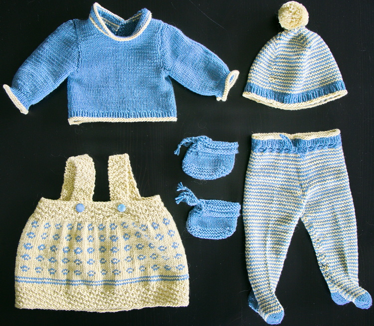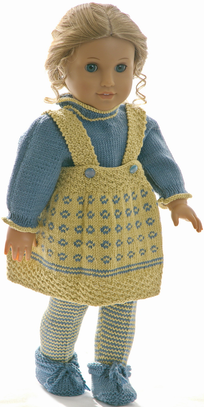 Bezaubernde Kleider für Ihre Puppe, dieses Mal in blau und gelb gestricktModell 0219D ELIANA - Rock, Kurzarmpulli, Strumpfhose, Mütze und Schuhe |