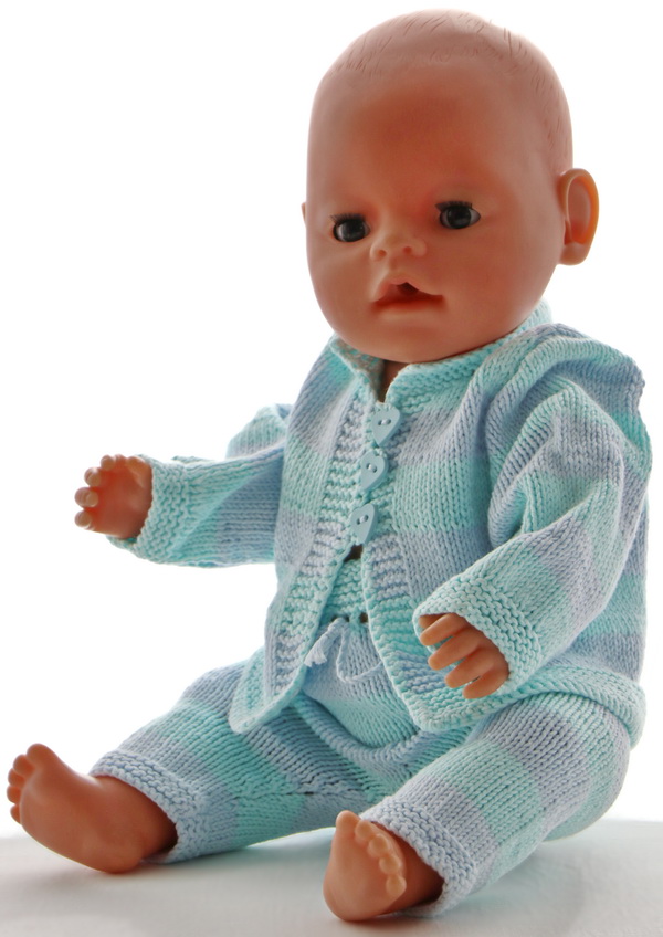 Then I knitted a nightgown for Hans. It has stripes in turquoise and blue. It is a buttoned front, and it has short-legged pants. (This fits to American Girl as well)