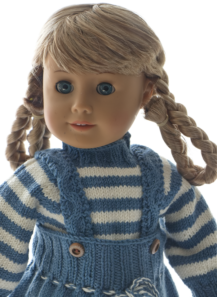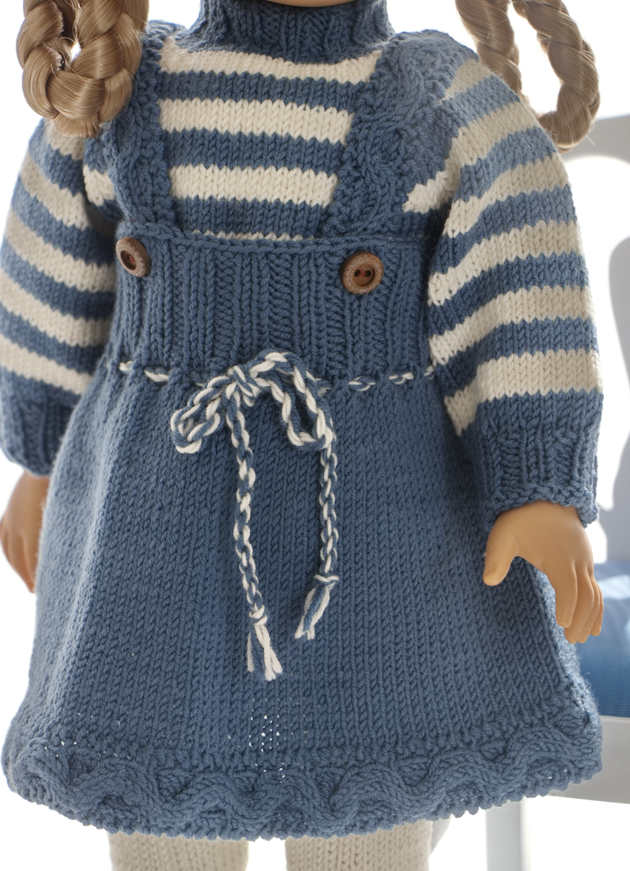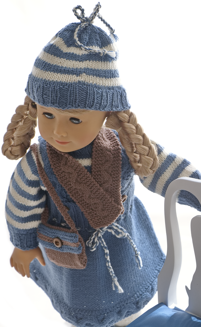Design 12 SYNNE- Doll knitting pattern for a complete outfit: skirt with suspenders, striped sweater, tights, cap, socks, scarf and shoulder bag. Designed for 17–18 inch dolls.