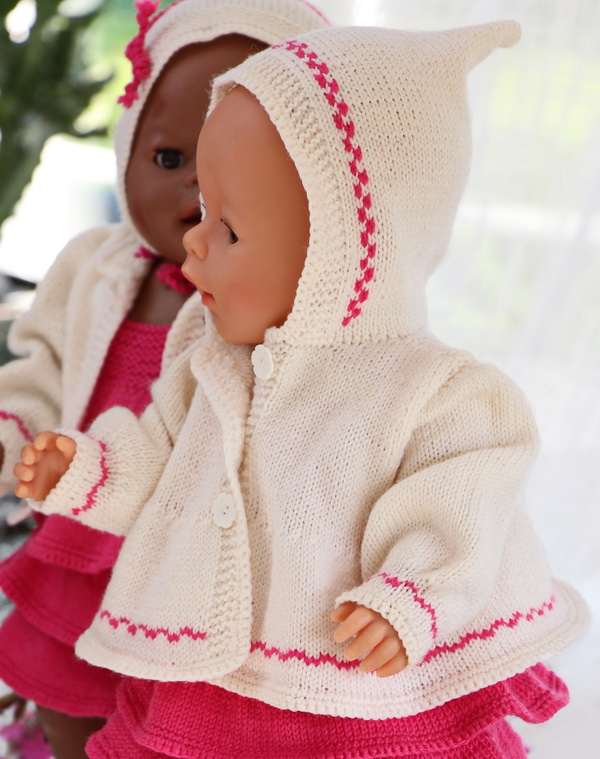 Then pattern has 2 jackets. One with a hood and one without. The jackets are knitted in white and have a little pattern in pink around the edges, around the sleeves and along the hood.
