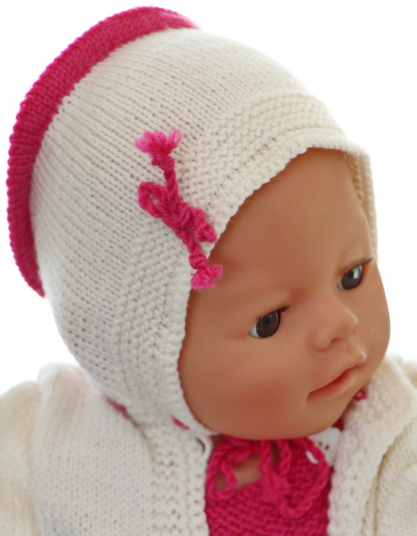 For your Baby born I knitted a cute little bonnet in white. The edge around the back in knitted in pink and one of the chords is made in a bow and sewed to the front of the bonnet. I am sure you will love this bonnet for your babydoll. It is very cute.
