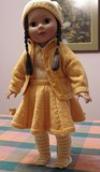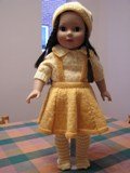 This outfit was made as part of a knit along on Ravelry. As I always do when knitting, I started to think about the many things the colors remind me of. This time the two shades of yellow made me think not only of real butter and eggs, but of a weed, linaria vulgaris, a snapdragon type plant that grew freely in the barnyard of my grandparents' farm. As many children do, my cousins and I used to make the blossoms "talk" by pinching the sides of the flowers. It's a happy memory of a time past which I think compliments this nostalgic design of a fashion from an earlier time.